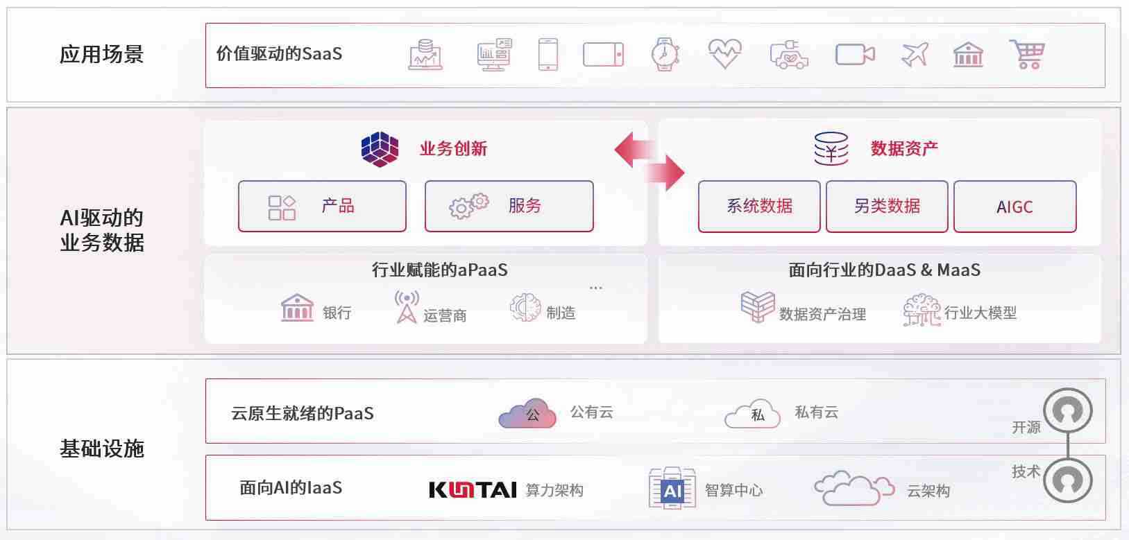 数字时代,,,,围绕企业数字化转型的关键要素,,,,365钱包数码开创性的提出数云融合战略和技术体系框架,,,,着力在云原生、、、数字原生、、、、AI原生和信创产业上架构产品和服务能力,,为处在不同数字化转型阶段的快消零售、、汽车、、、、金融、、医疗、、政企、、、、教育、、、、运营商等行业客户提供泛在的敏捷IT能力和融合的数据驱动能力,,,,构建跨界融合创新的数字业务场景和新业务模式,,,助力企业级客户建立面向未来的核心能力和竞争优势,,,,全面推动社会的数字化、、、、智能化转型升级。。。。