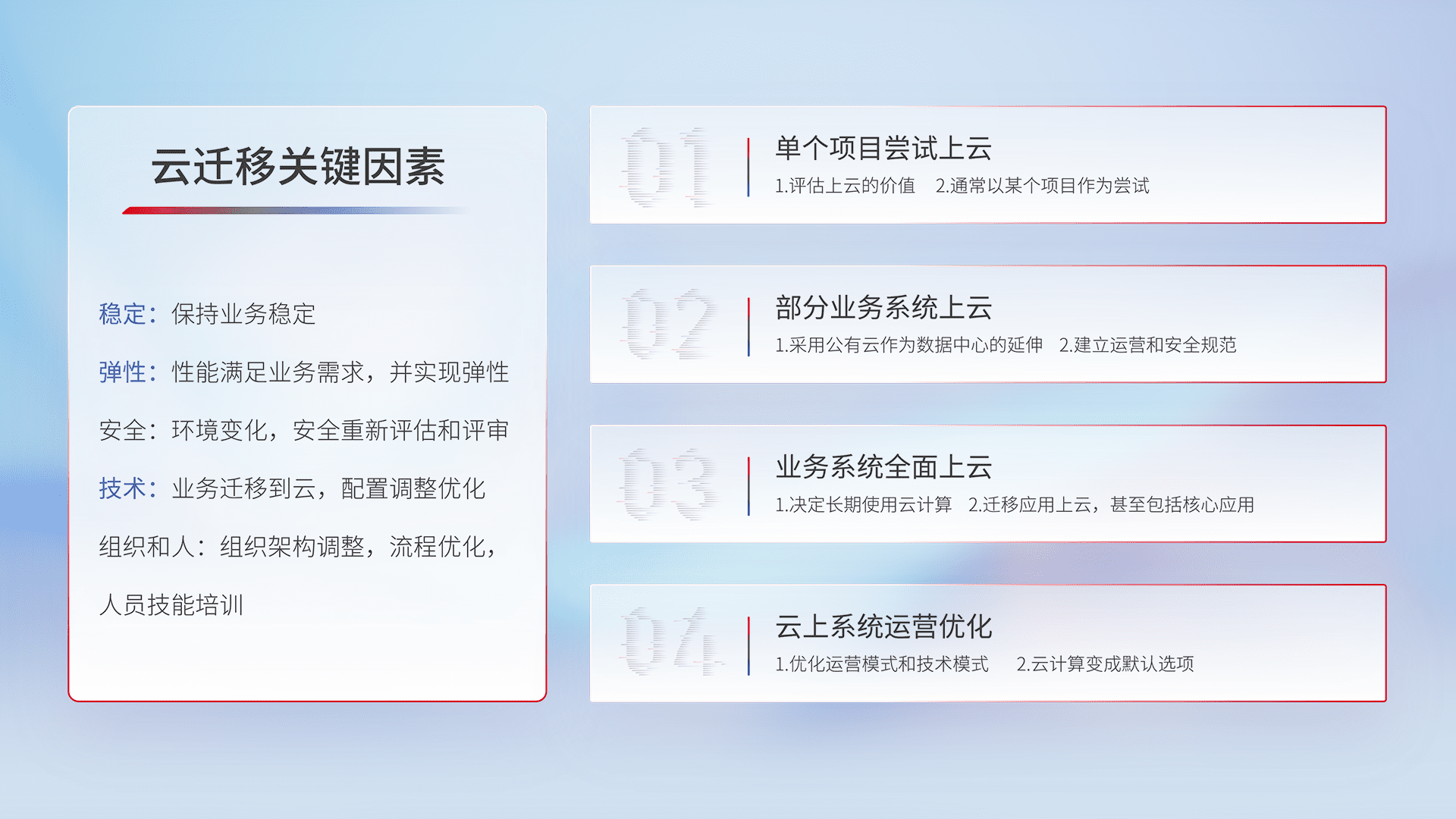 结合实际业务,,从规划设计、、云平台选型、、、、云原生改造、、、、数据迁移、、集成交付,,迁移全过程为客户识别最佳上云路径,,,做好风险识别管理,,设计网络架构、、身份权限、、、、安全审计合规、、、、操作审计、、日志审计、、、监控告警策略、、、多站点容灾设计等,,,,对云上基础设施进行整体规划,,提升IT治理水平,,,以满足弹性、、、高可用、、高性能的需求。。。